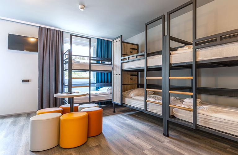We offer different sized shared rooms in a&o hostels - you can choose between rooms for a total of four, six or eight people. All of our shared rooms are generously sized and spacious, so there is enough room for everyone from travel groups to families. If you are traveling alone and choose a shared room, you have the choice of how many other guests you would like to share a room with.